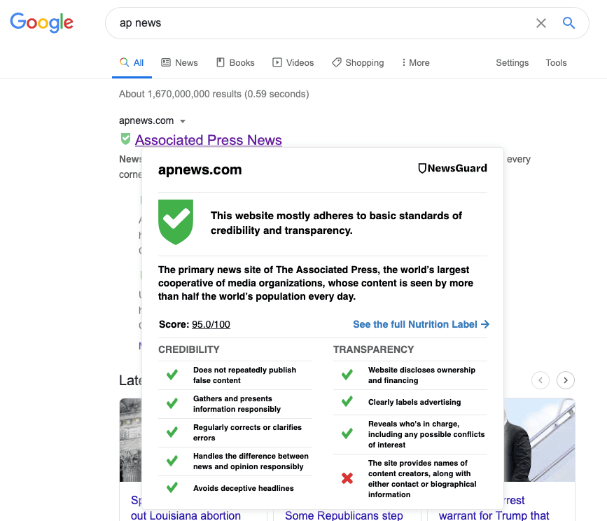 A green check mark indicates an overall approval rating. The source is reliable. For example, a Google search of AP News shows that they receive a green check mark because of their credibility score of 95.0/100.