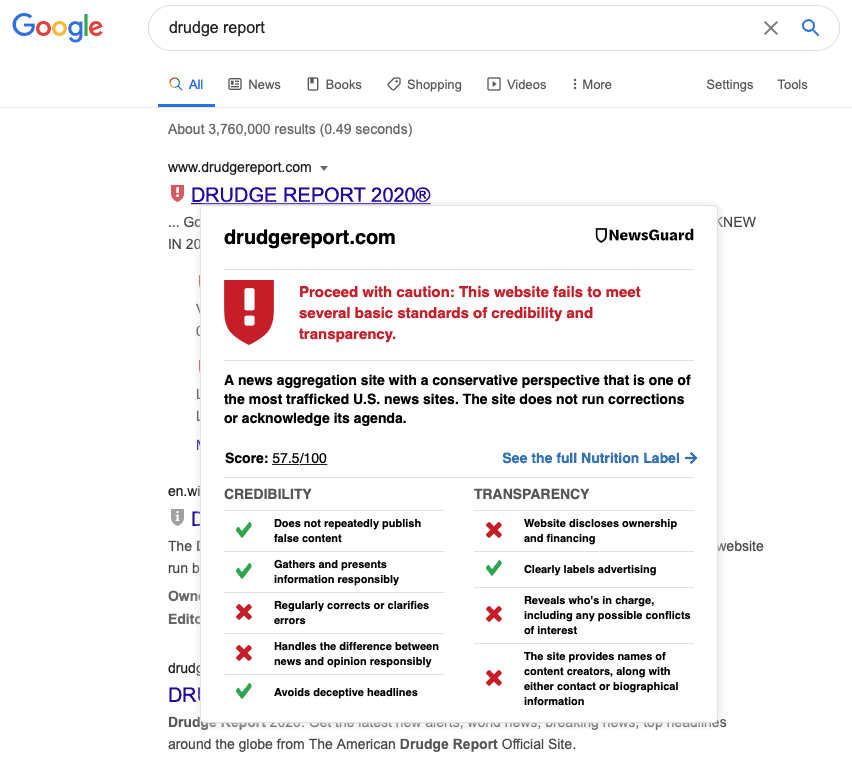 A red exclamation mark indicates an overall disapproval rating and a warning for the user. For example, a Google search of Drudge Report, a news aggregation site that does not run corrections or acknowledge its agenda, shows a failing exclamation point, indicating it does not meet NewsGuard’s standards of credibility.
