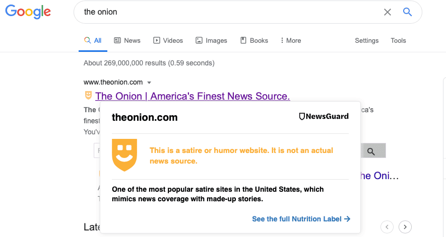 NewsGuard, a.k.a. “The Internet Trust Tool,” is a one-of-its-kind media literacy tool that aids internet news consumers to navigate through reliable and unreliable news sources online. NewsGuard is both practical and educational; news consumers are guided toward credible news sources while also learning industry standards for what constitutes truthfulness and reliability of news sources.